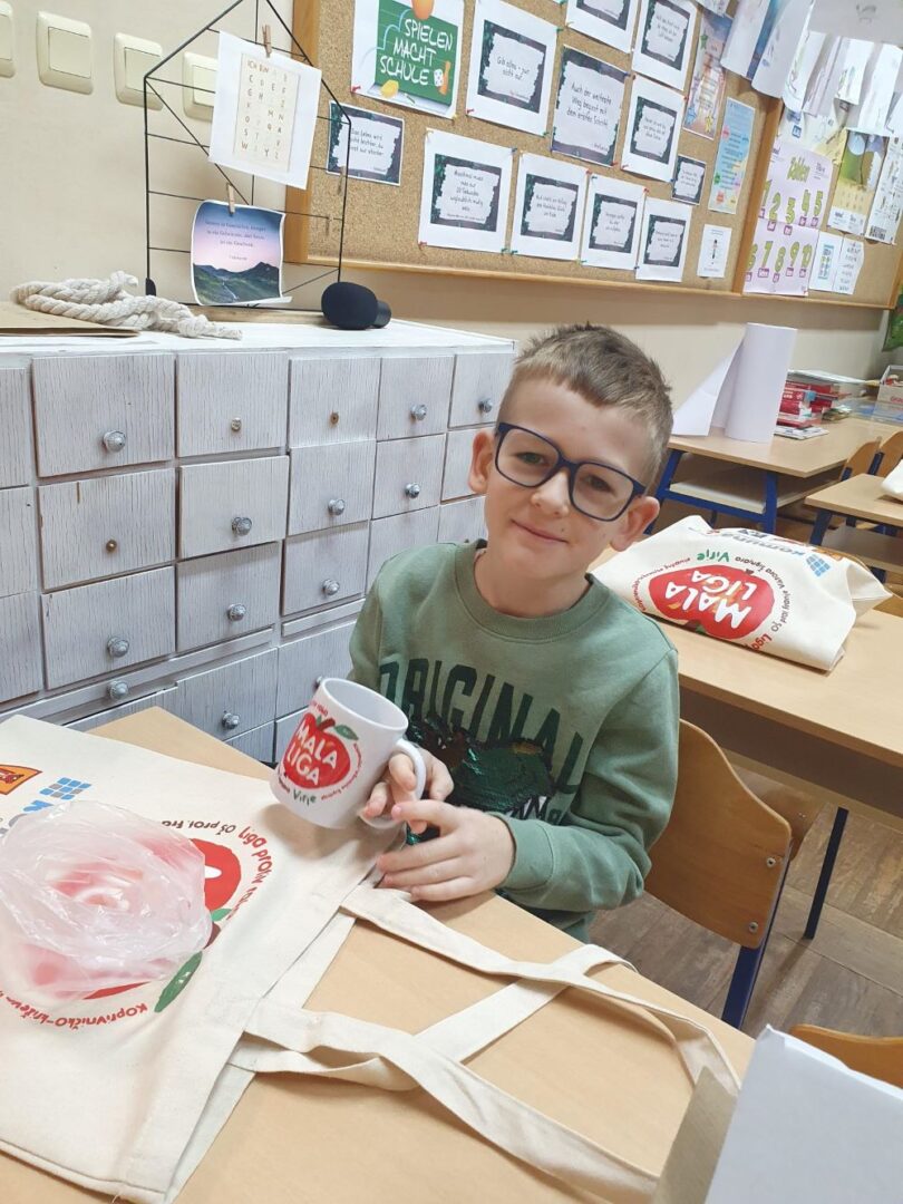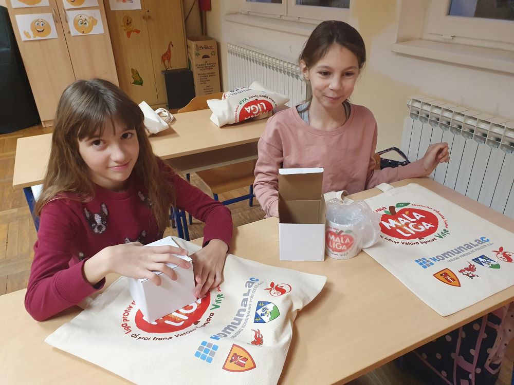 Osim uživanja u grickama i sokovima ligaši su dobili i božićne torbe i šalice s otisnutim logom Male lige. Naime, voditeljica Male lige učiteljica Nataša godinama prijavljuje projekte na natječaj Komunalca Gradskog komunalnog poduzeća d.o.o. te dobivenim financijskim sredstvima osigurava Maloj ligi neometani rad i dodatne materijale kojima promoviramo rad Male lige naše škole. Ove godine to su bile platnene torbe i šalice.