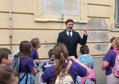 Odmah po dolasku u Zagreb učenike je dočekao Nikola Tesla. Kostimirani lik slavnoga izumitelja Nikole Tesle proveo je učenike povijesnom jezgrom pričajući im priče o svom životu, radu i brojnim zanimljivostima koje Zagreb skriva. Ovakav interaktivan povratak u prošlost oduševio je male istraživače.