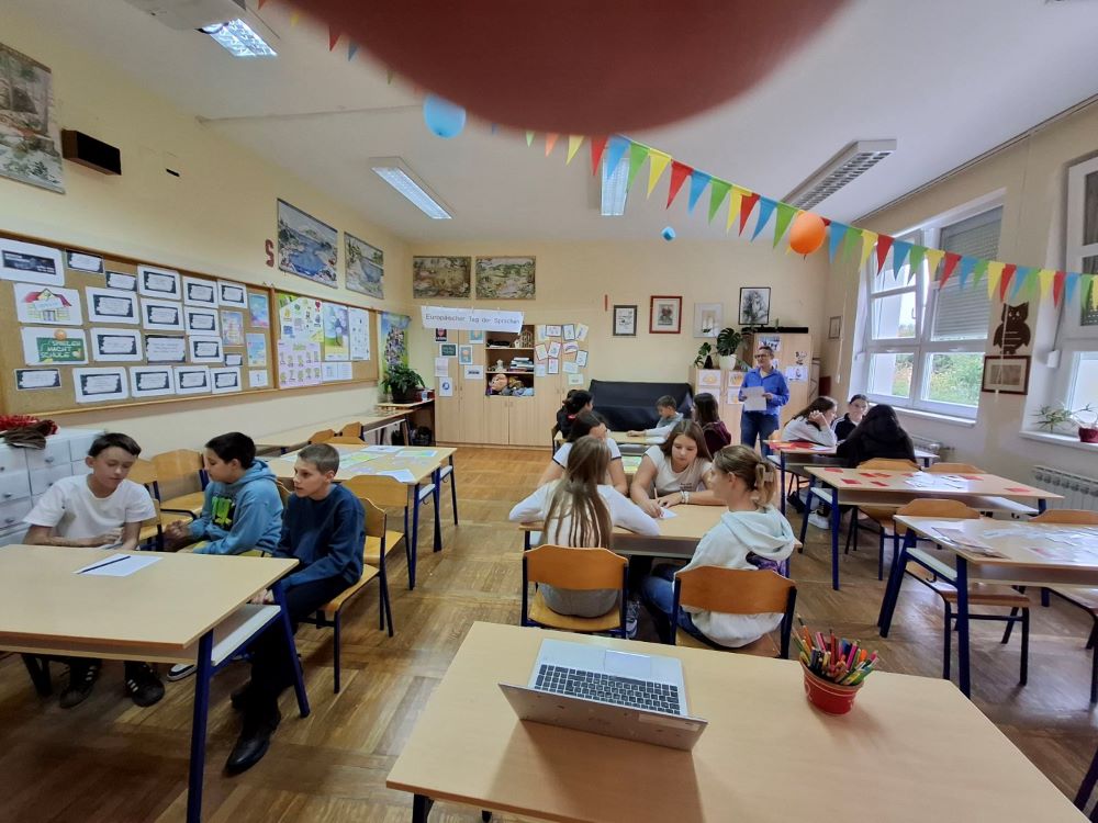 U petak, 26. rujna 2025. učiteljice Njemačkog jezika Nikolina Zglavnik Matica i Nataša Sušanj te učiteljica Engleskog jezika Ana Turk organizirale su obilježavanje Europskog dana jezika ili na njemačkom – Europäischer Tag der Sprachen. Uz učiteljice su sudjelovali učenici viših razreda koji vole strane jezike i rado ih uče.