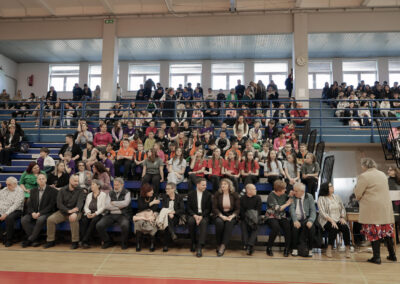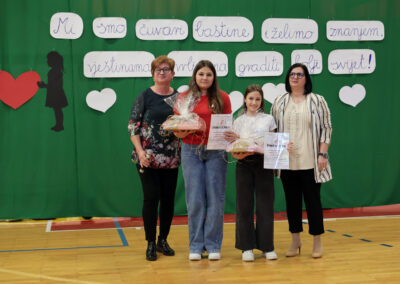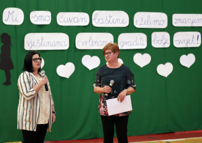 Ravnateljica Marica Cik Adaković pozdravila je sve prisutne i zahvalila na dolasku, posebice podupirateljima i prijateljima naše škole te umirovljenim djelatnicima kojima se radujemo svaki put kada nas posjete. Zahvalila je svima koji nas podržavaju u radu s učenicima, prate njihove uspjehe i raduju se snjihovim postignućima te je istaknula da je iznimno ponosna na sve naše učenike i njihove uspjehe (od županijske razine do državne razine). Sa školskom logopedinjom Ivanom Radić uručila je nagrade učenicima za izniman rad u izvannastavnim i izvanškolskim aktivnostima te sudjelovanje na natjecanjima. Ove godine nagrađene učenice su: Martina Bogdan (8. b) i Klara Posavec (7. a).