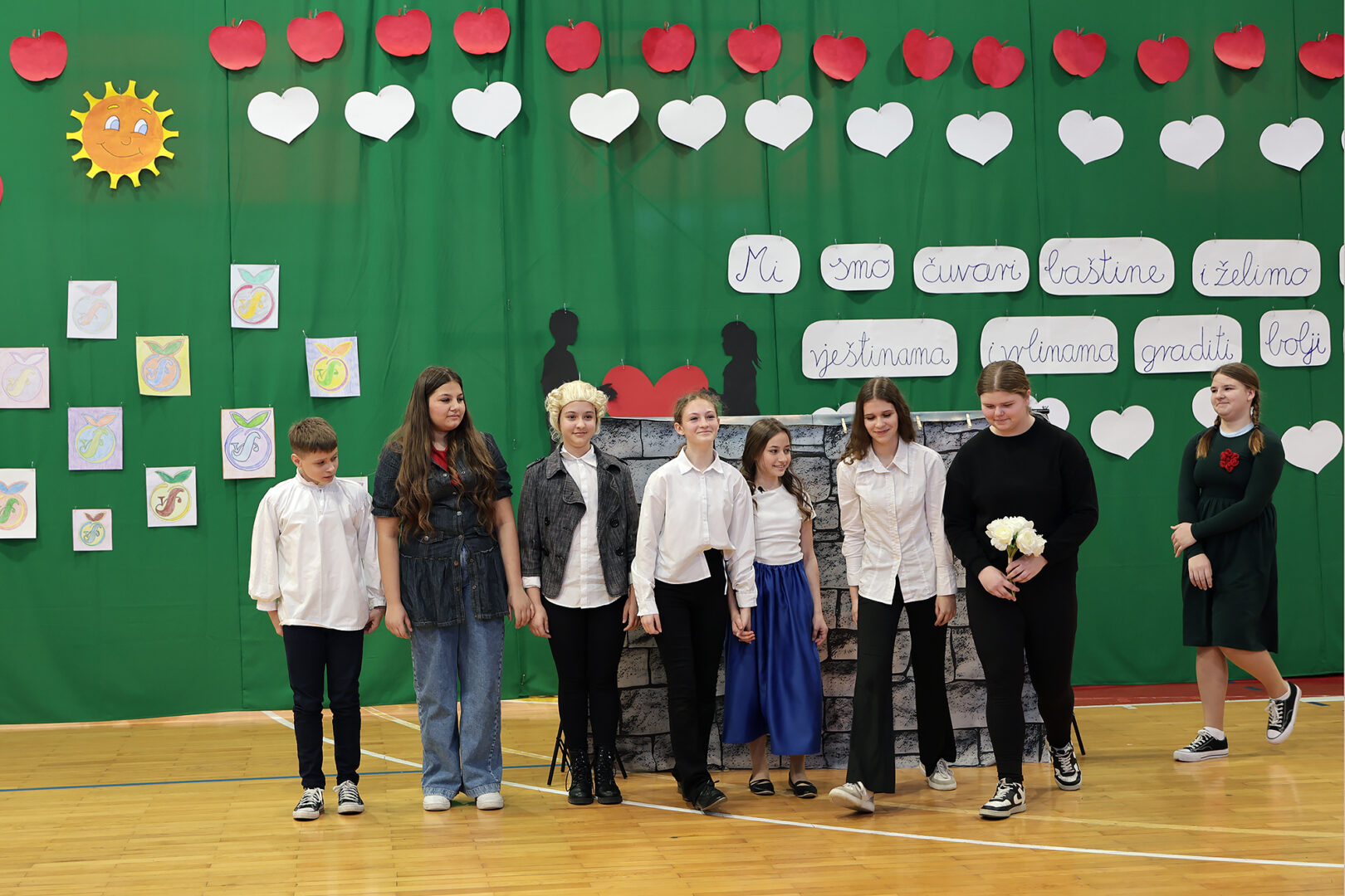 Za vizualni identitet pozornice zaslužni su članovi Likovne grupe i njihov voditelj učitelj Likovne kulture Josip Kovačić, konferansu su osmislili i uvježbali polaznici Kreativaca, Medijske i Novinarsko-literarne grupe uz pomoć učiteljica Ksenije Janković Vusić i Katarine Franjo, a voditeljice školske priredbe bile su učenice Tihana Ljubić i Tena Laloš.